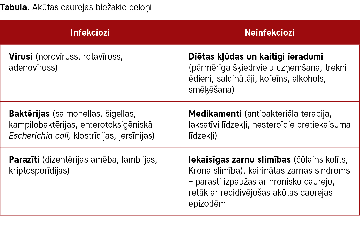 Visbiežāk akūtu caureju ierosina infekcijas. Vīrusu gadījumā parasti simptomātika ir vieglāka, bakteriālu infekciju gadījumā klīniskās izpausmes ir smagākas. Biežākie akūtas caurejas cēloņi apkopoti tabulā (3–5).