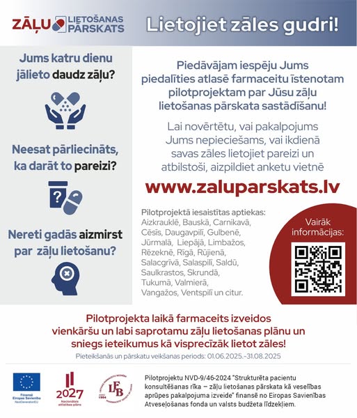 Pilotprojekta ietvaros 500 pacienti ar hroniskām slimībām, kuri ikdienā lieto vismaz piecus medikamentus, varēs saņemt zāļu lietošanas pārskatu – individuālu, padziļinātu farmaceita konsultāciju par pacientam noteikto zāļu terapiju, kurā īpaša uzmanība tiks veltīta pacienta zāļu lietošanas pieredzei un pacientam piemērota zāļu lietošanas režīma sastādīšanai.