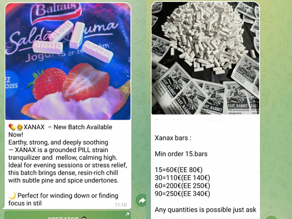 Tomēr varēja atrast arī divus “veikalus”, kas tirgo “Xanax” tabletes. Aptiekās 30 tablešu iepakojums maksā ap 10 eiro, bet “Telegram” – par simts eiro vairāk. Vienā “Telegram” grupā minimālais pasūtījums ir 15 tabletes, otrā – par 30 eiro var nopirkt piecas tabletes.