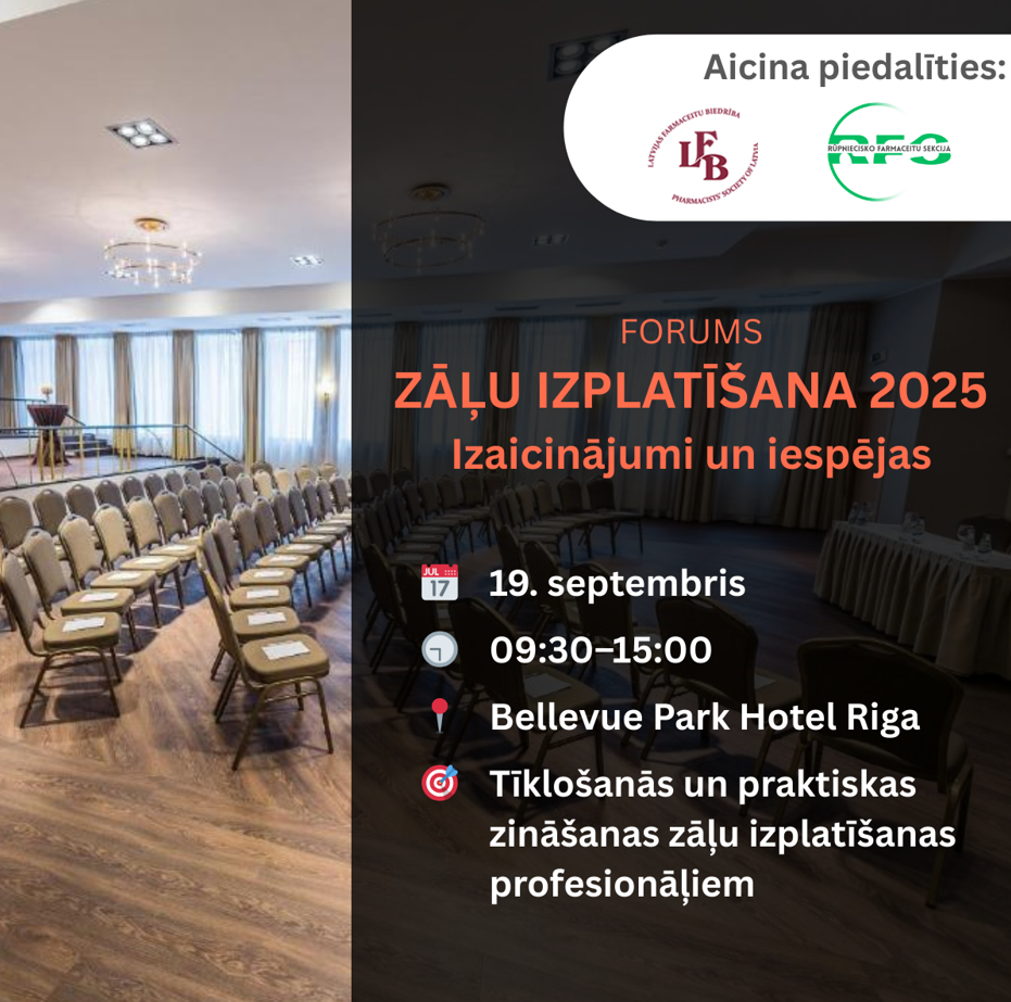 Latvijas Farmaceitu biedrības Rūpniecisko farmaceitu sekcija (RFS) 2025. gada 19. septembrī aicina Latvijas zāļu lieltirgotavu atbildīgās amatpersonas un to vietniekus, lieltirgotavu vadītājus, valdes locekļus, kā arī citus darbiniekus, kas saistīti ar kvalitātes uzraudzību, piedalīties forumā “Zāļu izplatīšana 2025. Izaicinājumi un iespējas”